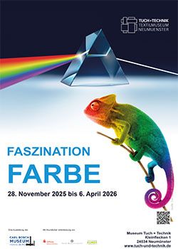 Rot, Grün, Blau statt trist und grau. Farben umgeben uns in sämtlichen Lebensbereichen –vom Blau des Himmels über das Rot mancher Gesteine oder das Grün der Pflanzenblät-ter. Doch wie entstehen Farben? Und welchen Zweck erfüllen sie? Was ist Farbe und wie vielschichtig wird der Begriff Farbe verwendet? Die Sonderausstellung „Faszination Far-be“ geht diesen Fragen nach und verdeutlicht dabei, wie facettenreich und faszinierend das Thema Farbe ist. Die Ausstellung des Carl Bosch Museums Heidelberg ist vom 28. November 2025 bis zum 6. April 2026 im Museum Tuch + Technik in Neumünster zu se-hen.